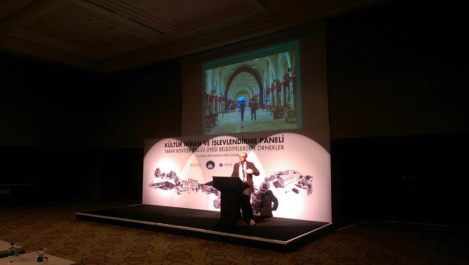 Antalya’da düzenlenen Yapex 2016 fuarında Kültür Mirası ve İşlevlendirme, Tarihi Kentler Birliği Üyesi Belediyelerden Örnekler Paneli’nde ÇEKÜL Vakfı’ndan Mimar Alp Arısoy Sokollu Mehmet Paşa Külliyemizi örnek proje olarak anlattı.